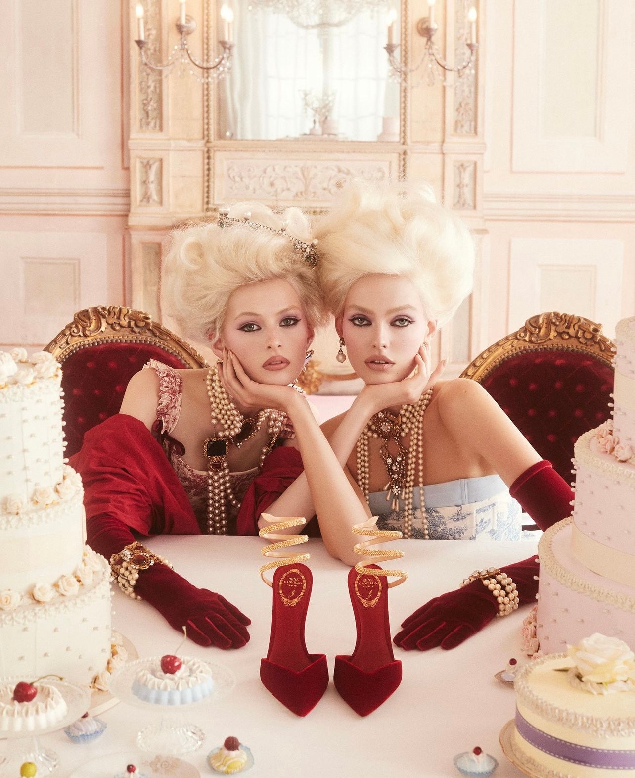 René Caovilla Christmas advertisement featuring the Morpho corset in red Toile de Jouy. Photographed by Nima Benati and styled by Giorgio Andrea Branduardi assisted by Rebecca Lai.