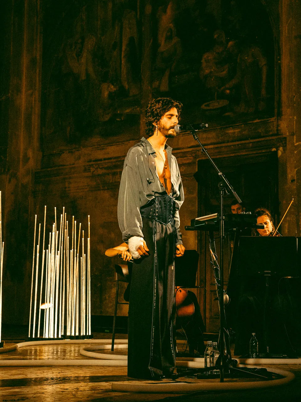 Alessandro De Santis (Santi Francesi) wearing a custom silk corset belt at “Piccole liturgie musicali” concert. Styled by Daniela Cornacchia (@chiamatelamimi) assisted by Gloria Orefice.