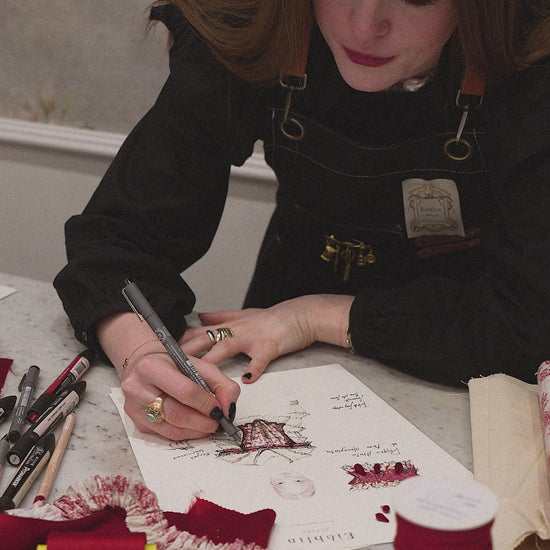 A romantic frayed ruffle in toile de jouy and red silk charmeuse, to add charm and character. Embellished with Austrian crystals in the top front.